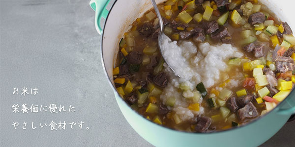 農薬・化学肥料不使用で育てられた地元京丹後産の有機野菜と、シニア犬も食べやすい柔らかい鹿肉を使用したウェットフードです。薬膳の考え方を取り入れ、愛犬の体と季節のリズムが合うようサポートします。