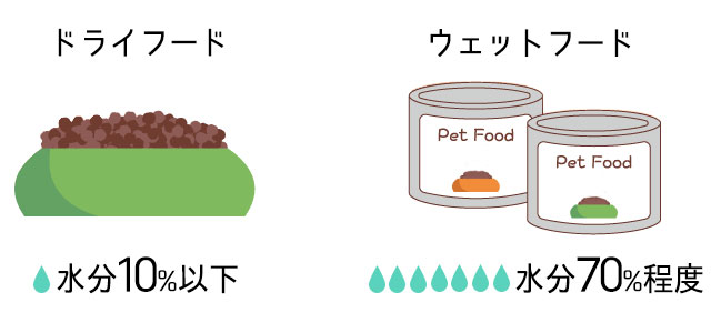 一般的にドライフードの水分は10%以下、ウェットフードは70%程度の水分を含んでいます。