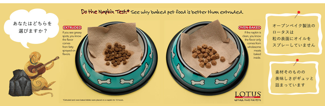 ロータスドライフードは製法にもこだわったオーブンベイク製法。ロータスウェットフードは余分な水を加えない調理法。どちらも原料のおいしさを追及した、全年齢対応のドッグフード・キャットフードです。