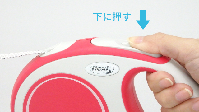 - ブレーキボタンを押し、ロックボタンを前方へ押すとリードの長さが固定されます。