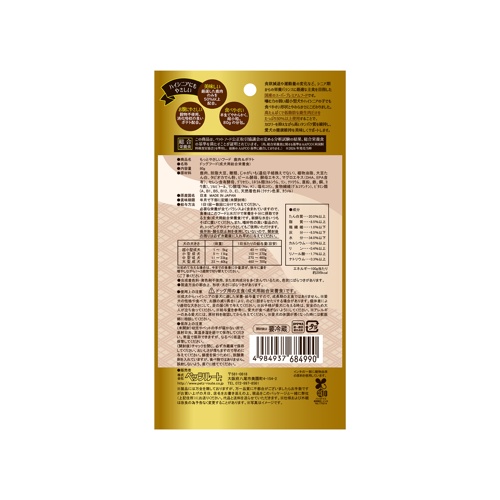 - 鹿肉、脱脂大豆、糖類、じゃがいも(遺伝子組換えでない)、植物油脂、大豆たん白、タピオカでん粉、ビール酵母、酵母エキス、マグロエキス(DHA、EPA含有)、セレン含有酵母、グリセリン、ミネラル類(カルシウム、リン、ナトリウム、亜鉛、鉄、銅、ヨウ素)、ソルビトール、リン酸塩(Na、K)、ソルビトール、リン酸塩(Na、K)、塩化コリン、食物繊維(グルコマンナン)、ビタミン類(A、B1、B5、B12、D、E)、天然着色料(クチナシ色素、カラメル)