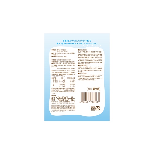 - 【使用上の注意】ドッグ&キャット用のおやつです。※本品は間食です。生後3ヶ月位まで(離乳期前後)の幼犬・幼猫には与えないでください。※お子様が愛犬・愛猫に与える時は、安全のため大人が立ち会ってください。※アレルギーのある愛犬・愛猫には、原材料を確認してから与えてください。※愛犬・愛猫の体調が悪くなった時には獣医師に相談してください。 【開封時の注意】<未開封>幼児やペットの手が届かない所で、直射日光、高温多湿を避けて保存してください。<開封後>袋口を閉じ、必ず冷蔵庫で保存してください。なるべく早くお飲みください。
