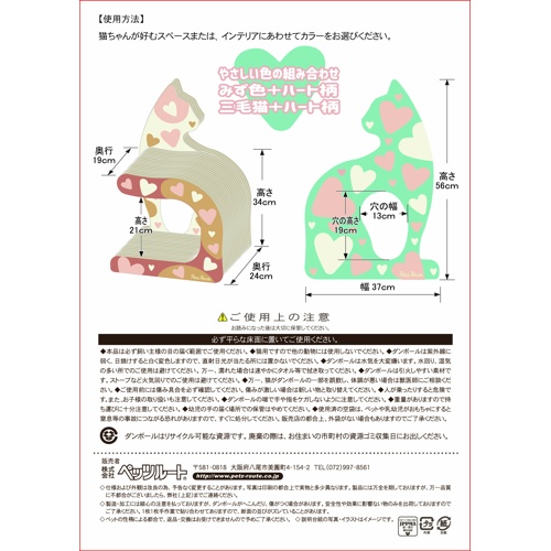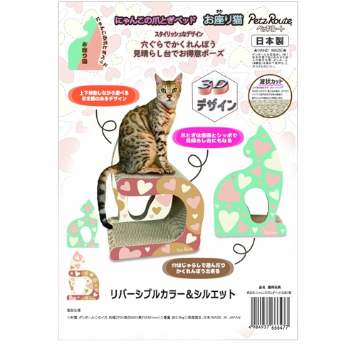 - 座ったシルエットとハートフルな優しいリバーシブルカラーを組み合わせたデザイン。正面の穴から覗き込み猫ちゃんとじゃらしで遊んだりかくれんぼうができる。裏側を使うと三毛にゃんカラーに変身。立体感のあるシッポは十分な幅を持たせ思う存分爪とぎできる形状。爪とぎは底面とシッポで見晴らし台にもなります。