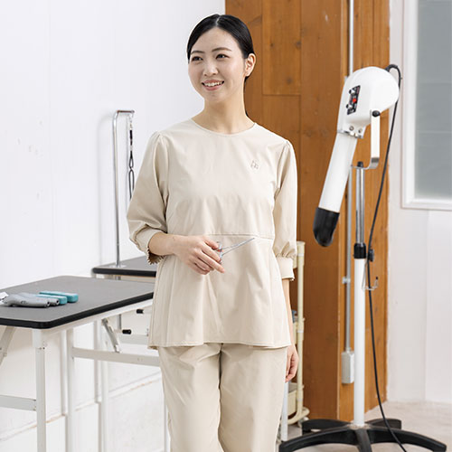 - 袖口はゴム仕様で作業時に簡単に袖丈を変えることが出来ます。前の首元は開きすぎず毛が入りにくい仕様で、着脱は後ろのボタン4つで簡単にできます。後ろの首元にポイントとなるパールボタンをつけています。前身頃は作業がしやすいようにすっきりしたデザインにして、後ろにはギャザーがあることで体型カバープラス女性らしさのあるデザインに。
