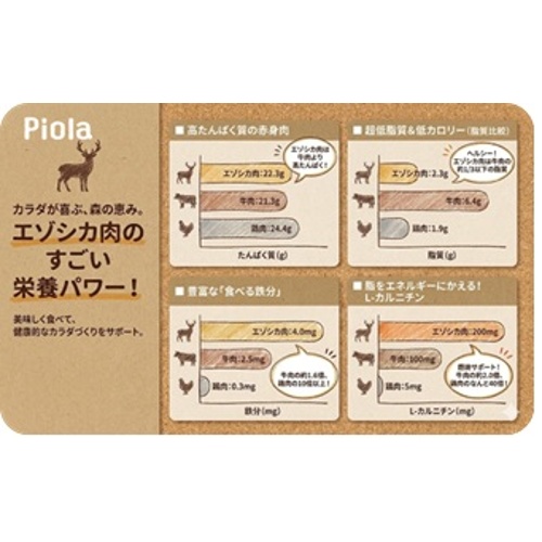 - 生鹿肉、豆類(脱脂大豆)、野菜類(エンドウ蛋白)、いも類(馬鈴薯でん粉)、ゼラチン(牛由来)、コラーゲンパウダー(牛由来)、油脂類(植物性油脂、亜麻仁油)、食物繊維、グルコサミン(カニ由来)、サメ軟骨抽出物(コンドロイチンを含む)、増粘安定剤(ソルビトール、グリセリン、カゼインナトリウム)、ミネラル類(リン酸カルシウム、炭酸亜鉛、塩化ナトリウム、塩化カリウム、炭酸カルシウム、セレン、硫酸鉄、硫酸マグネシウム、硫酸銅、炭酸マンガン、ヨウ素酸カルシウム)、酸味料(発酵乳酸)、ビタミン類(コリン、C、E、A、ニコチン酸、パントテン酸、B12、B6、B1、B2、葉酸、D )、アミノ酸類(DL-メチオニン、トリプトファン)、酸化防止剤(ミックストコフェロール、ハーブ抽出物)