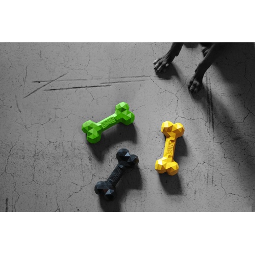 硬すぎず、柔らかすぎず、ワンちゃんが夢中になる”ちょうどいい噛みごたえ”を追求したおもちゃです。中心の穴におやつを入れる事で遊びながら頭を使う知育トイに。
