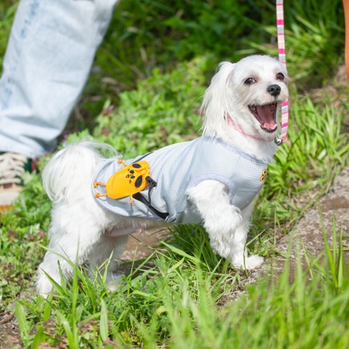 - ドッグウェア「BUDDYポーチ」 背中で愛嬌を振りまくBUDDY君は、スマイラーブランドで大人気のキャラクター。 実はこのBUDDY君、おやつなどを収納できる「ポーチのギミック」になっているのが最大の特徴です。 可愛いだけでなく、暑い日には保冷剤を忍ばせることで、大切な愛犬を熱中症から守る心強い「相棒」へと早変わり。 本体素材には通気性に優れた高機能メッシュを採用しました。 速乾性が高く、お洗濯後もすぐに乾くのは、毎日使いたい飼い主さんにとって嬉しいポイント。 ストレッチの効いた生地が愛犬の快適な動きを優しくサポートし、気になる紫外線も効果的に軽減します。 サイズはXSからLまでの4展開。 サイズチャートをご確認の上、愛犬の体形に合ったサイズをお選びください。 別売りの同じBUDDY君モチーフのドッグスリングと合わせれば、飼い主さんとの「スマイルシンクロ率」は100%に! まるで頼れる相棒がいつも背中に寄り添ってくれているような安心感と共に、最高にハッピーなお出かけを楽しみませんか? ■カラー:オレンジ、シルバー ■サイズ:XS、S、M、L ■素材:メッシュ素材(速乾・ストレッチ・UV軽減